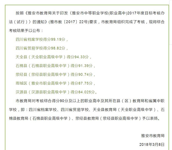 四川新闻网雅安3月16日讯(王三刚 图/文)近日,雅安市教育局印发《关于雅安市中等职业学校(职业高中)2017年全年工作任务目标考核结果的通报》,四川省档案学校得到99.19的高分,在考核中摘得桂冠。 此次目标考核在2017年年初即开展,持续一年,雅安市内7所中职学校(职高)全部参与。学校在得到考核通知后,立即组织全校师生,对照目标任务考核要求,积极开展工作。按照要求,2017年学校全面开展管理水平提升行动,启动教学诊改工作,编制“十三五”规划,完善制度建设和专业发展规划,开展信息化建设工作,参与脱贫攻坚与扶贫助学,启动现代学徒制试点工作,强化校企合作,探索县校合作模式,不断加强宣传工作,开展了大量创新且富有成效的工作。通过完成考核任务,学校的管理愈加规范,教育教学水平明显提升,教职工团结一心谋大事、干实事的愿望也更加强烈,有效地促进了学校发展。 学校本次荣获雅安市中等职业学校(职业高中)2017年全年工作任务目标考核第一名,仅仅是学校发展成果和荣誉中的一部分。近年来,由于各方面成绩突出,学校获得“国防教育特色学校”“全国五四红旗团委”“四川省民族团结进步创建活动示范学校”“市级标准化学生宿舍”称号,被批准为省级现代学徒制试点单位和“国家职业技能鉴定站”,是中国社会福利基金会“授渔计划”项目学校和雅安市慈善总会“慈善助学”帮扶学校。学校被省政府网站报道1次,中央电视台报道10次,四川电视台报道1次,雅安电视台报道12次,人民网、新华网、中青网等中央、省、市媒体报道500余次。学校的知名度和美誉度得到极大提升。 四川省档案学校定将以过去的成绩为鞭策,再接再厉,砥砺前行。一是坚持立德树人,强化思想引领,培育“德才兼备,知行合一”的优秀人才;二是坚持专业为主,做精、做强品牌特色专业,创建现代化实训基地;三是开展现代学徒制试点工作,强化校企合作;四是加大订单培养力度,大力促进学生高质量就业;五是优化人才队伍结构,打造高品质“双师型”教师队伍,力争将学校建设成让学生快乐,让家长放心,让社会满意的省级示范学校。 |