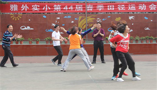 四川新闻网雅安4月19日讯 雅安市外国语实验小学为丰富教职工的业余体育生活,浓厚和谐文明的校园文化气息,促进全校教职工健身活动的开展,强健教职工的身体素质,以更好的精神面貌投入到教育教学工作,学校工会结合学生第44季春季运动会,于4月18日下午,在学校操场组织开展了雅外实小2017—2018学年教职工春季趣味运动会。在全体教职工的鼎力配合,工作人员的热情支持下,运动会取得了圆满成功。