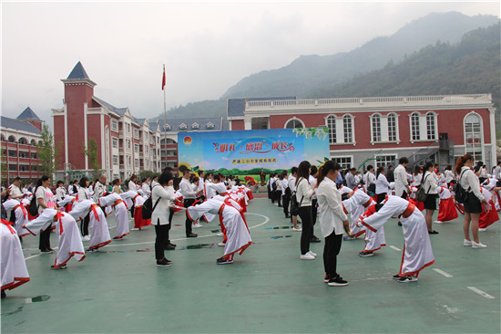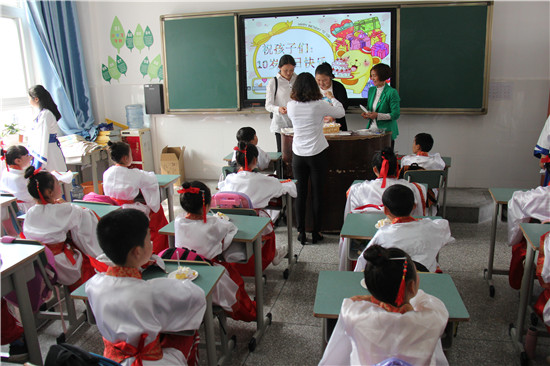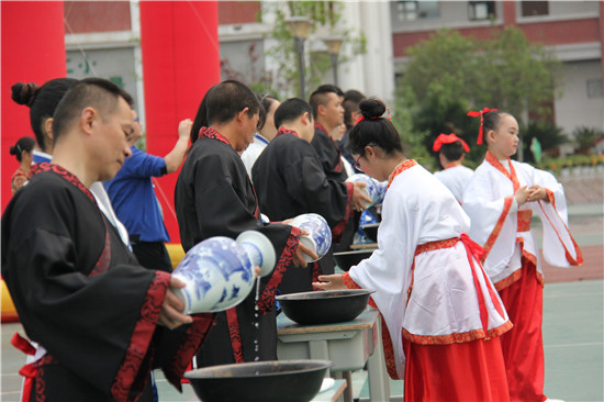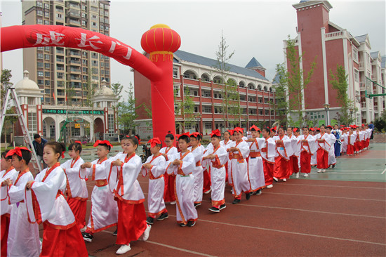 此次活动包括三个篇章。第一篇章“明礼篇”,通过“奉匜沃盥”、“肃容正衣”环节,让学生了解传统文化精髓,知礼识礼,争做谦谦君子;第二篇章“感恩篇”,通过“父母箴言”、“礼谢父母”、“师送祝福”、“礼谢老师”环节,让学生知道恩从心来,报从体行;第三篇章“成长篇”,通进家长牵着孩子的手迈入“成长门”、“聆讯受礼”环节让学生学会担当,明白成长的含义。 当孩子面对父母,向父母三拜行礼时,虔诚的九十度鞠躬礼,让父母的眼角浸满泪水;当父母看着孩子亲手制作的感恩卡,听着孩子发自肺腑的话语(爸爸妈妈您辛苦了,爸爸妈妈我爱您),感受到孩子温暖的怀抱时,就是男儿也抑制不住感动的泪水。“感恩的心,感谢有你……”孩子们整齐的手语表演,将这场融入中华传统文化内涵的“成长礼”推向了高潮。 “十岁成长礼”是严道二小“三典礼”仪式教育中的一个重要部分,它不仅标志着一个新的人生起点已经到来,同时也意味着孩子们应该告别顽皮、告别淘气,需要学会更多的本领,懂得更多的道理,承担更多的责任,付出更多的关爱。希望十岁的孩子们,做温润有礼、立责于心、广趣良习的阳光少年!