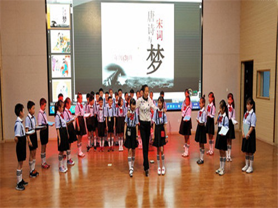 21个班的学生在语文老师的精心指导下,经过紧张而精心的准备,信心满怀的投入比赛,有古诗配乐朗诵、诵唱、古诗词串烧接龙、古诗词歌舞表演等多种艺术表现形式,精彩的表演赢得了阵阵掌声。最后,评委老师在六个年级中分别按年级评出了一、二、三等奖。