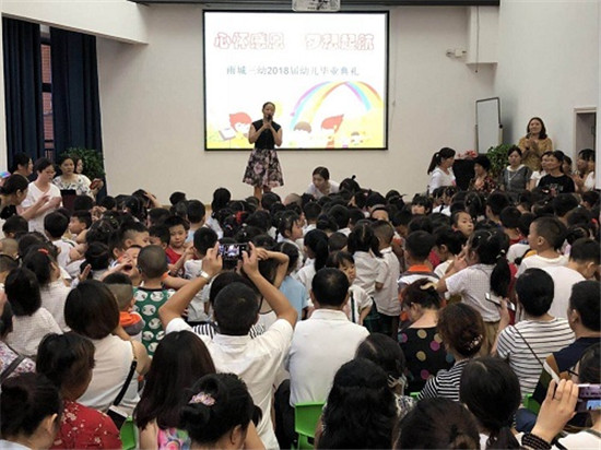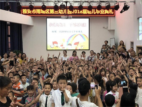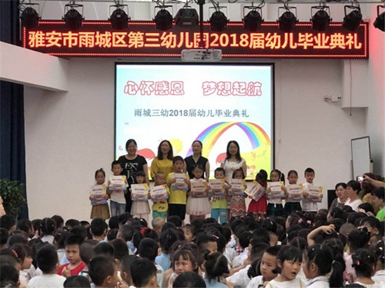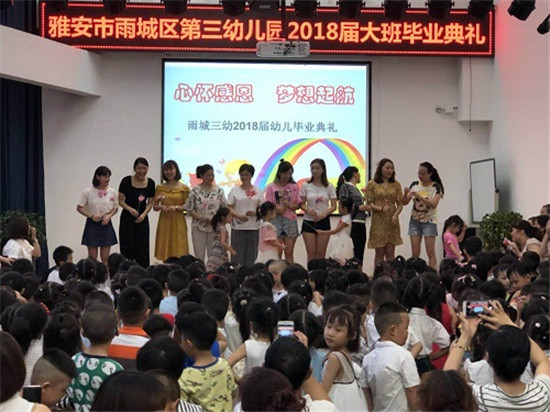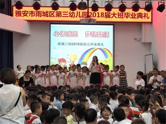 四川新闻网雅安6月26日讯 总说毕业遥遥无期,一转眼各奔东西,一年不止有四季,还有一种季节,叫做毕业季。2018年6月26日上午,雨城三幼大班组的小朋友们以及他们的爸爸妈妈,还有老师们欢聚一堂,举办了主题为“心怀感恩,梦想起航”2018届毕业典礼。首先冮绍琴园长一番热情洋溢、鼓舞人心的致词拉开了大班小朋友人生中的第一个毕业典礼的序幕,冮园长给孩子们送上了最真挚的祝福。之后家长代表发言,她用朴实的话语真诚地感谢全体教师为孩子的成长付出的心血和汗水。 接着在孩子们欢乐的《毕业歌》中,听出了他们最真最纯的美好回忆。在《老师谢谢你手语舞蹈》表演中看出了他们的依依不舍之情。表演结束后孩子们还向老师献上了一束束美丽的鲜花,由衷地表达了对老师最真挚的祝福。最后到了最令人激动的颁发毕业证书时刻,孩子们从几位园长妈妈的手里郑重而礼貌的接过证书并报以深深的鞠躬表示感谢!毕业的日子,是感恩的日子,也是离别的日子,更是喜悦的日子,幼儿园是人生长途中的第一站,愿孩子们不断进步,走出精彩人生。