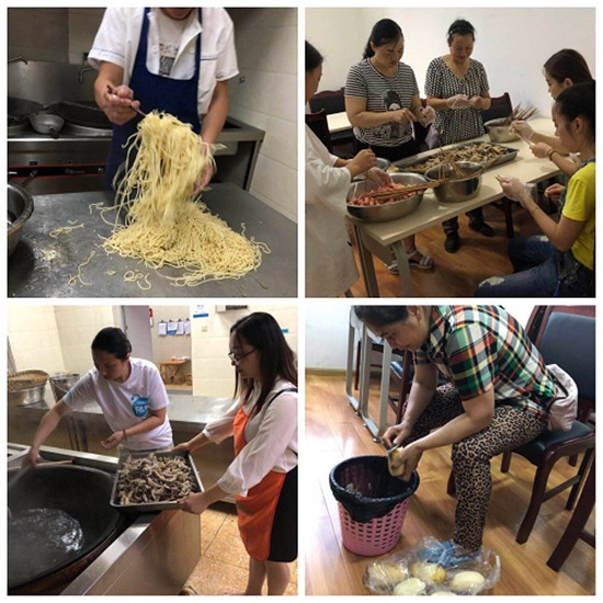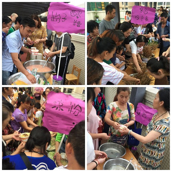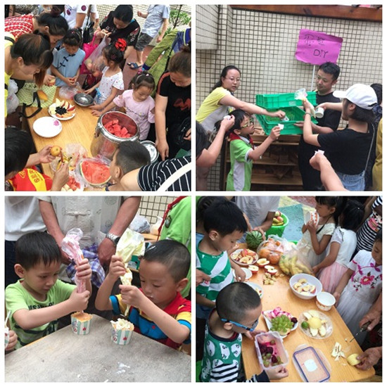 接下来最期望已久舌尖上的美味活动即将开始喽!制作美食的家长朋友们,早早来到幼儿园准备食材,提早下手,一大波美食正在路上.....在“食神”家长们的帮助下,老师在各班指定位置摆放好各式各样的食材,如水果拼盘组、特色冷串串组、五彩汤圆组、凉粉凉面组、蛋糕DIY组以及冰粉凉糕组,真是色香味俱全,让人垂涎三尺。品尝活动采取了班级与班级之间“串着吃、分享吃”的形式,孩子们不仅可以吃到自己班级的美食,也可到其他班级组别去任意品尝美食。美食亲子活动进行地如火如荼,快看,小朋友们正吃得津津有味呢,美味在口,已经两耳不闻窗外事,一心沉醉美食中!