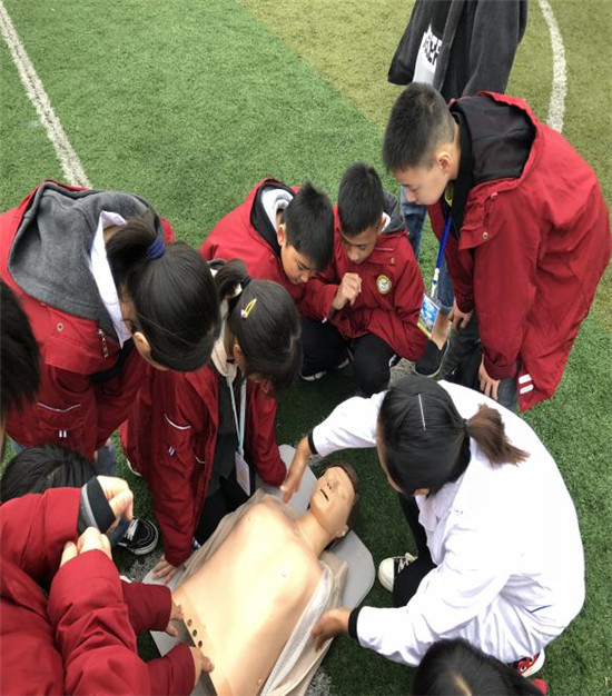 晨曦初晓的校园宁静祥和,绿草如茵。操场上同学们热情高涨,齐聚在救护老师的同围,认真的学习急救知识。老师们针对学校学生的情况,采用在现场讲解、真人结合模型示范操作、多点演示的方式,把单人心肺复苏操作、AED(自动体外除颤器)的使用、解除气道异物梗阻的海姆立克急救法等常用的急救知识,深入浅出的对全体师生进行了普及培训。培训现场积极踊跃互动频繁,同学们在急救专家的指导下初步了解掌握了一些常用的急救知识,取得了良好的培训效果。 同学们踊跃参与心肺复苏操作练习,老师手把手教同学们操作手法。 紧急救援中心蒋春梅和师资张仕虎老师为同学们讲解气道异物梗阻的海姆立克急救法。 |
