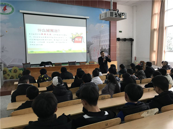 四川新闻网雅安12月4日讯(李仪 文虞瑞 文/图)为弘扬社会主义法治精神,让法治走进校园,进一步增强雨城区草坝中学师生的法治观念,建设平安和谐校园。该校邀请了雨城区人民检察院“未雨情”工作室检察官郭城、共青团雨城区委副书记杨浦、雅安市公安局办公室副主任下派草坝派出所警官黄珊前往我为我们开展了主题为“宪法在我心中”的讲座于12月4日上午10点活动准时进行。