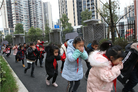 演练中,各班班主任及各楼层值日老师第一时间到岗到位,协助学生队伍快速、有序的撤离。各班学生在班主任的指导下,都能按要求弯腰屈膝,用小手绢、纸巾或手捂着口鼻,跟着队伍迅速撤离到学校操场,整个过程做到听从指挥、快速有序!
