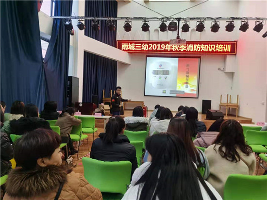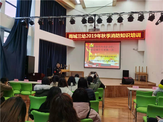 老师结合近年来的火灾案例特别是高层建筑、电气火灾案例,就消防日常管理、平常检查、遵守以及疏散逃生的基本常识、消防火灾的应急和预防、消防器材的正确使用方法进行了深入浅出的讲解。期间,教职员工结合自己工作和生活中所接触到的消防安全隐患提问,进行了互动与沟通。老师又列举了大量实例和现场的图片,展示缺乏消防意识和消防知识的严重危害。最后结合实际,对火灾 特点、预防火灾的基本常识,火灾发生、发展、熄灭的基本规律和特点等方面知识进行了讲解,传授了防范措施和如何对初期火灾进行扑救,以及如何组织人员疏散、火场自救逃生方法等知识。 通过这次消防安全的培训,进一步提高了教职员工的消防意识及逃生技能,为打造“平安校园,和谐社会”创造了良好的环境。(雨城三幼供稿)