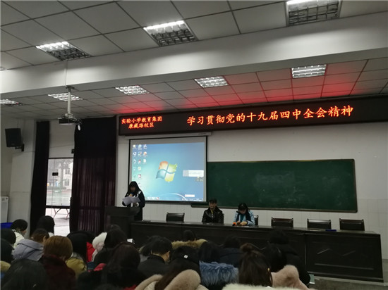 四川新闻网雅安12月26日讯(徐娅娟 文/图)12月25日下午,根据雅安市雨城区教育系统的统一部署,雨城区实验小学教育集团康藏路校区召开了学习宣传贯彻党的十九届四中全会精神宣讲会。由实验小学教育集团康藏路校区党支部书记胥凤琴作宣讲报告。实验小学教育集团党总支书记洪小平、副书记廖家琼、支委耿寄翔以及实验小学教育集团康藏路校区全体老师参加了宣讲报告会。