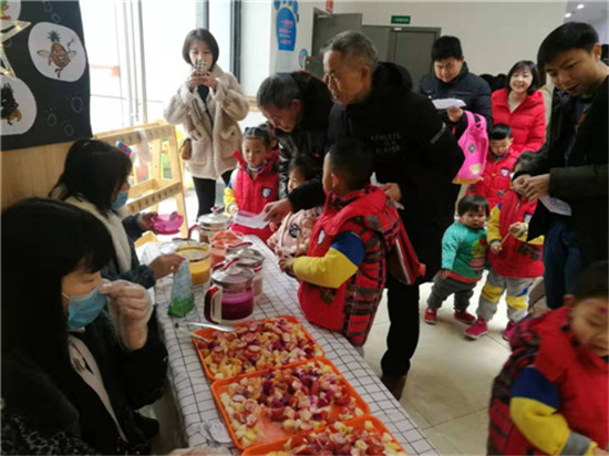 开展了“庆元旦迎新年,美食狂欢节”活动。全体师生、家长共聚操场,在升旗仪式后,大班孩子们精彩的《鼓舞飞扬》表演瞬间将现场气氛点燃。13间美食小店摆放的美食“诱惑”,让人垂涎欲滴,有香气四溢的笑笑汤、有热腾腾的五彩汤圆、有色味俱全的甜水面、有唇齿留香的水果串串、有甜蜜蜜的玉米棒......孩子们拿着碗筷,穿梭在各俱特色的美食店,感受“美食节”的快乐。家长和孩子们分享着有趣的小店名称:一只酸奶牛、藕然相遇、米娃当家、笑笑汤店、神奇汉堡......在用餐过程中,孩子们心怀感恩,不忘与家长、老师、同伴一起分享美食。