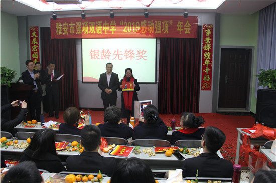 王祥高校长讲到强项双语中学过去一年的辉煌成绩,离不开所有教师的辛勤付出,特在这喜庆的日子里予以表彰。表彰会上,陆续颁发了强项新人奖、奋斗奖、模范奖、精英奖、银龄奖、先锋奖、功勋奖,对工作突出的教师依次进行了表彰。最后,王校长和大家分享了工作心得和成功经验,并对未来的新目标提出了殷切的希望。