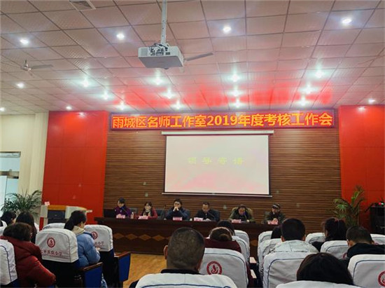 此次考核采取两种考核形式,分别是:1.根据《雨城区名师工作室2019年年度考核评估量化表》的要求进行资料审核和评估。2.现场展示:各名师工作室导师通过ppt汇报展示本工作室年度工作情况。