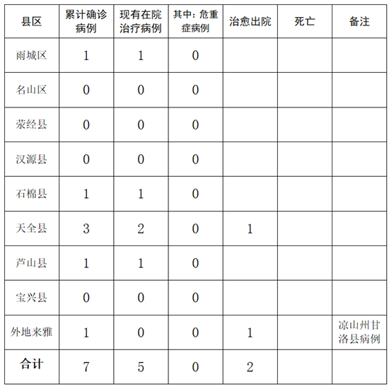 四川新闻网雅安2月16日讯(王梦倩 文/图)2月16日,本网从雅安市卫生健康委员会获悉,2月15日0-24时,雅安市无新增新冠肺炎确诊病例。截至2月15日24时,雅安市累计确诊新冠肺炎病例7例,累计治愈出院2例,现有隔离治疗病例5例,均病情稳定。