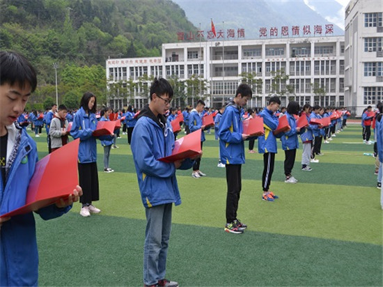 四川新闻网雅安4月23日讯(岳洪林 刘丽琳 文/图) 4月20日清晨,绚丽朝霞托起骄阳,五星红旗高高飘扬,宝兴县中学的操场上书声琅琅,全校1021名学生正在国旗下集体齐声诵读《少年中国说》,诵读感悟中华经典,推普助力脱贫攻坚。