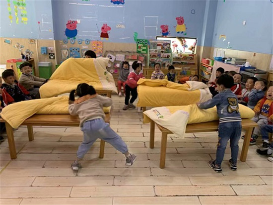 注重活动引领。组织大班幼儿开展了擦床、穿衣服、叠被子、穿鞋子等趣味游戏比赛活动,活动前,教师通过示范,让幼儿仔细观察,获取简单的劳动技巧。随后,鼓励孩子们积极参与、动手操作,从中体验劳动的辛苦、乐趣。