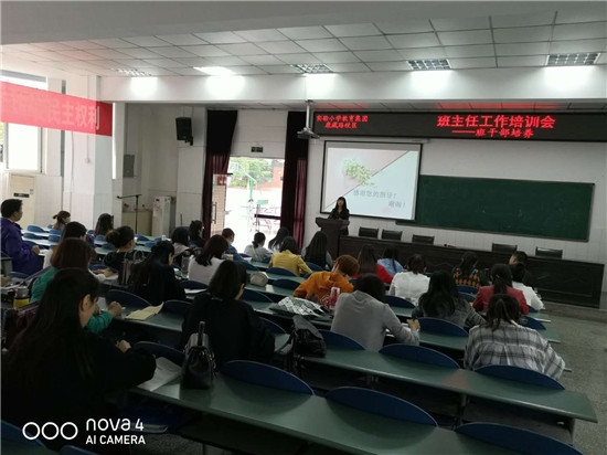 班主任是学校德育工作的灵魂人物,是教育教学工作的核心力量。为全面提高班主任的德育水平,推动班主任队伍的建设,切实提高班级管理的有效性,营造和谐、文明、奋进的校园文化氛围。5月12日下午,实验小学召开了全校班主任工作例会,本次会议的主题是班干部的培养。 施永琼老师为全体班主任做低年级“建设新班级班干部培养”专题分享。施老师分别从以下几方面分享:一、用心灵去发现;二、入学文明礼仪训练;三、课堂常规训练;四、小干部实质任务训练;五、一周总结评比。在分享过程中,施老师所教的一年级二班小干部们还向老师们现场展示了“课题常规指挥”,小干部们精彩、镇定自若地指挥赢得了在场老师们的热烈掌声。施老师的专题分享让与会的班主任们在班干部的培养方面受益匪浅。 刘波老师就中段如何培养班干部做了经验分享。她认为首要的是了解全班学生状况,要有一双发现的眼睛,发现以前未被挖掘出的有能力的孩子作为班干部的培养对象。