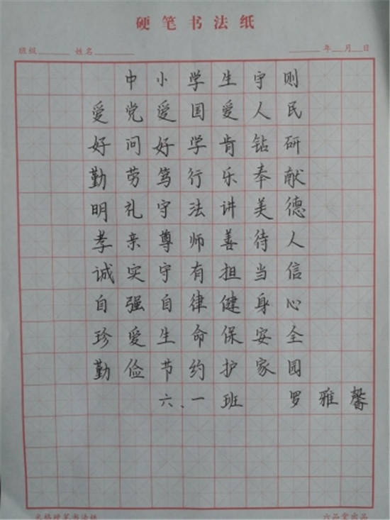 四川新闻网雅安5月15日讯 2015年修订的《中小学生守则》共9条,282字,涵盖了学生德、智、体、美、劳全面发展的基本要求。为了让学生深刻理解《中小学生守则》的内涵,号召学生认真践行《中小学生守则》,并培养学生良好的书写习惯,实验小学教育集团北二路校区于5月15日组织四至六年级学生举行了《中小学生守则》硬笔书法比赛。 赛前,老师们首先组织学生温习《中小学生守则》,并向同学们进行解读,帮助大家深刻理解《中小学生守则》的内涵。比赛开始,同学们聚精会神,一丝不苟地书写,横竖撇捺,一笔一画,书写端正,排版美观,令人赏心悦目。