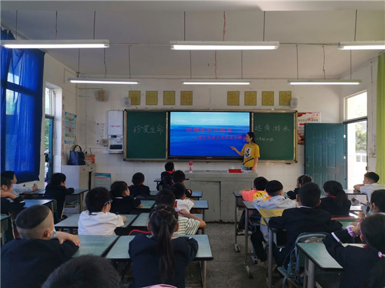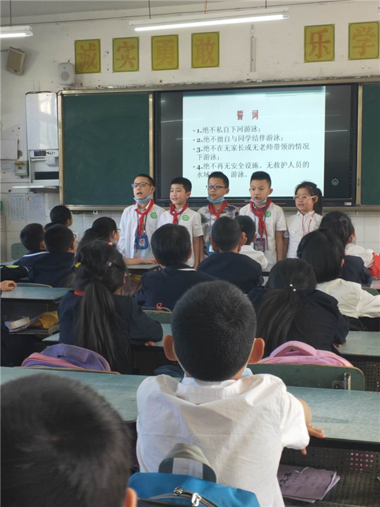 早上第一节的班会课上,各班班主任还充分结合本班的特点,给学生上了一节防溺水专题的安全教育主题班会课。各班采用不同的方法引导、教育学生如何预防溺水。一是利用网络以鲜活的事例警示学生,向学生介绍溺水事故的危害性及严重后果;二是向学生介绍游泳安全知识,教学生掌握一些简单的自救办法;三是教育、引导学生以正确的认识和科学、安全的方法参与夏季有关活动,树立防溺水意识,杜绝学生无家长陪护到河中游泳;四是给学生进行施救演练,面对他人落水时,如何正确进行施救以及临时抢救相关知识。学生们认真地听老师讲防溺水知识,认真地观看老师的示范,并将防溺水安全知识熟记于心。