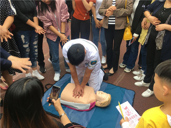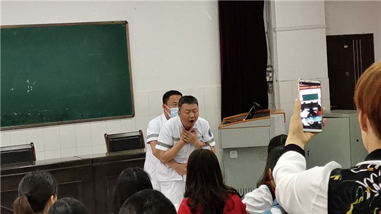 培训会上,吴鹏主任结合“什么是现场急救”“现场急救的黄金救命时间”“心肺复苏的操作步骤”“海姆立克急救法”等几方面的内容,通过PPT和现场示范相结合,为全校教师详细地讲解了紧急救护知识。老师们学习热情高,认真听仔细记,还亲自拍下PPT的相关内容,并就自己不了解的问题与吴主任进行了现场交流。