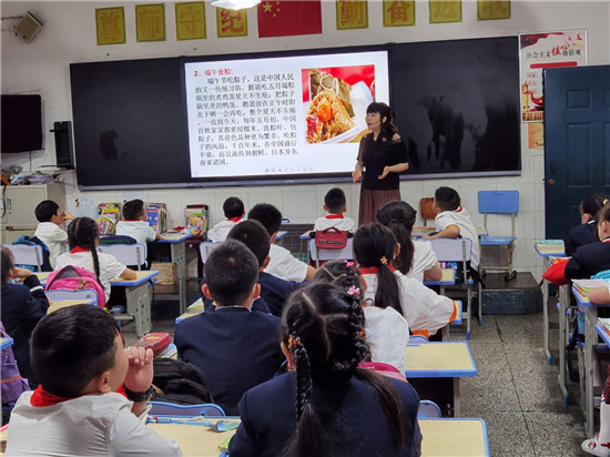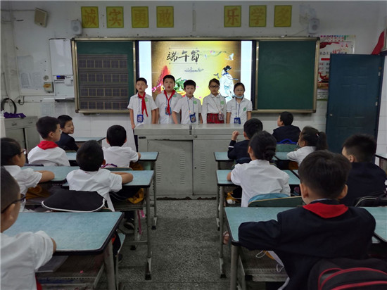 首先,学校充分利用国旗下讲话、黑板报、宣传栏等多种方式广泛宣传有关"端午节"的由来与习俗。其次,各中队根据活动主题,深挖活动素材,认真构思活动内容,精心组织教育活动。低年级主题班会上,孩子们通过教师讲解、学生讲故事、观看小视频、观看传统文化知识等形式就端午节的由来、传说、纪念意义、风俗习惯等进行了交流学习,让孩子们感受端午节的文化内涵和传统佳节的独特魅力。中、高年级各班级组织学生诵读端午民俗诗歌、屈原诗词,了解龙舟、艾草、香袋、五彩丝线、雄黄酒等在端午节期间的特殊用途,让学生充分感受传统文化的魅力,增强爱国主义情感。