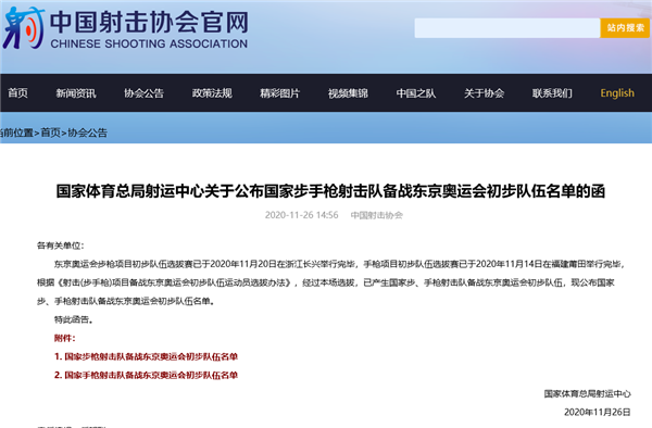 姚云骢入选国家步枪射击队备战东京奥运会初步队伍名单
