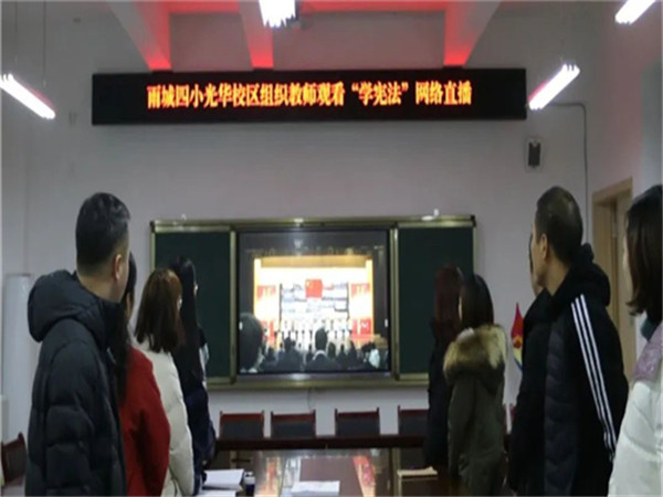 雨城四小光华校区组织教师观看教育部全国青少年普法网国家宪法日“宪法晨读”直播活动。学校负责人对活动作具体安排,组织教师同步跟读宪法部分章节,欣赏了教育部谱写创作的歌曲《宪法伴我们成长》。
