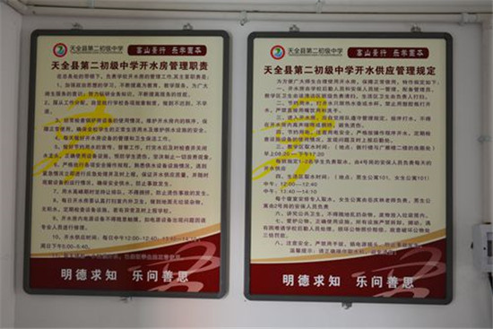 捐赠的开水器 四川新闻网雅安5月18日讯(高纪志 文/图) 天全县第二初级中学是一所全寄宿制学校,目前在校学生600余人。该校原有一间集中供水室,用于师生热水供应,但集中供水室是燃气式锅炉,热水达不到饮用水标准,师生日常饮用水只能靠电水壶少量的供应,满足不了师生饮水需求。 开水房管理规定 雅安市教育基金会在知道此情况后,迅速到学校调研,经过3次实地考察,通过听取汇报、询问师生详细了解情况后,决定向该校捐赠总价值6.8万元的开水器20台,用于解决师生饮用水问题。 开水器投入使用 近日,热水器已全部安装完毕,投入使用。 该批开水器的使用,满足了该校师生日常饮水需求,为学生的健康成长提供了有力保障。该校表示,感谢市教育基金会的爱心捐助,此批开水器解决了学校的燃眉之急,全校师生将心怀感恩之心,用爱岗敬业的工作精神和优异的成绩回报社会。该校也将安派专人管理开水器,制定师生用水管理办法,努力做到规范、安全使用。 |