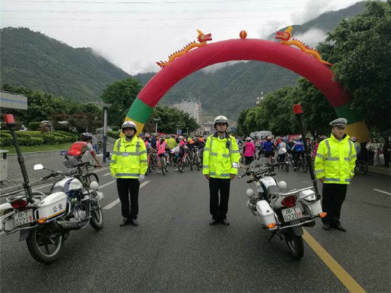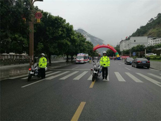 四川新闻网雅安5月31日讯 近日,“纪念中国工农红军强度大渡河胜利82周年暨‘体彩杯’自行车赛”在石棉隆重举行。石棉县公安局交警大队高度重视、提早谋划、精心部署,全警动员,圆满地完成了此次交通安全保卫任务。 比赛期间,李志强大队长深入一线靠前指挥,全体参战民警认真按照交通安保方案要求,提前进入工作岗位,冒雨对重点路段进行严防死守。同时根据活动开展所面临的交通管理形势组成了开道巡逻组、路面执勤组和应急处突组,对进入比赛路段的车辆进行了管制,并坚持把文明执勤、规范执勤贯穿于交通安保工作的各个环节,有效避免了伤亡事故的发生。赢得了上级领导和社会各界人士的一致好评。