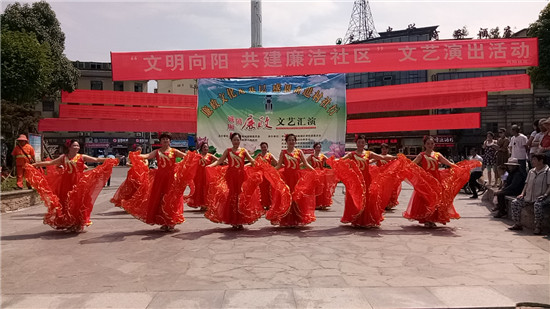活动现场 活动现场 四川新闻网雅安6月27日讯(李琼会 文/图)今(27)日上午,由天全县城厢镇向阳社区举办的以“文明向阳 共建廉洁社区”为主题的创建国家卫生县城暨廉政文化进社区文艺演出活动在该县音乐广场举行,给广大市民带来了一场内涵丰富的文化盛宴。 活动现场 活动在老年大学表演的《欢乐腰鼓》中拉开帷幕,继后由向阳社区腰鼓队表演的舞蹈《雪山姑娘》、串烧舞蹈《响扇+最炫中国梦+太极梦》、健康舞蹈《中国威武》,安居小区健康队表演的快板《卫生健康最重要》等节目,把一个宜居、健康、和谐、文明的新向阳展示在人们面前,吸引了众多市民驻足观看。最后,活动在城厢镇机关文艺宣传队带来的舞蹈《党旗飘飘》的歌舞声音中落下帷幕。 健康舞蹈《中国威武》 城厢镇机关文艺宣传队表演舞蹈《党旗飘飘》 据悉,此次活动由天全县城厢镇党委、政府主办,城厢镇纪委、镇妇联、镇群团服务中心、镇文化站、镇关工委、向阳社区等单位共同承办。活动现场,承办单位还举行了创建国家卫生县城和党风廉政建设满意度测评相关知识问答互动,社区“五老”同志、社区志愿者现场散发宣传资料、开展文明劝导、提供咨询服务等,倡导每一位天全儿女从我做起、从现在做起,积极投身国家卫生县城,全面落实党风廉政建设责任制,营造风清气正廉洁和谐环境。 表演《党旗飘飘》 |