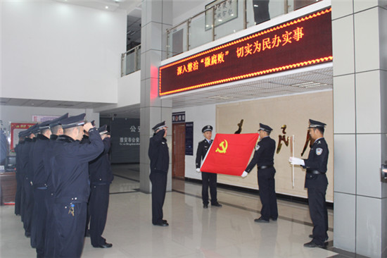 四川新闻网雅安12月13日讯(程爽 文/图)12月7日下午2时15分,名山区公安分局党委成员、各部门负责人和各支部委员会书记集中到分局底楼办公大厅,在分局党委书记张文清的率领下,面对党旗,重温了入党誓词。 随后,分局召开党建工作推进会,分局党委委员、纪委书记陈庆对下一步的党建工作提出了四点要求,一是分局各支部务必按照前期党建专项检查要求,立即开展查漏补缺,分局将会进行再次复查;二是政工监督室要针对前期检查发现的问题,提前谋划2018年全局党建工作,在2018年1月份制定分局党建工作规范性文件下发;三是各支部书记务必高度重视党建工作,要把支部大会作为重点,召开支部大会的简报必须有照片,严禁弄虚作假闭门造车;要把党小组会和主题当日活动作为难点,二者要进行有机结合,不能机械理解,要把党建工作和队伍建设工作以及业务工作进行有机结合,以党建促队建,推动公安业务工作;四是加强督导检查,2018年起,要把党建工作作为分局专项督察的一项内容,督察发现的问与分局绩效考核要进行挂钩,真正把党建工作落到实处。