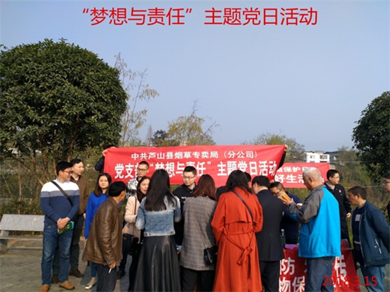四川新闻网雅安3月20日讯(李婉玥 图/文)为进一步提高芦山县烟草专卖局党支部凝聚力和战斗力,充分发挥党员干部先锋模范作用,3月15日上午,芦山县烟草专卖局结合“3.15国际消费者权益日”活动,组织开展了“梦想与责任”主题党日活动。全体党员、共青团员参与了此次活动。 活动中,参与人员除完成规定动作外还和专卖稽查人员一起设立咨询台,开展普法宣传活动。向来往市民发放《雅安烟草普法小课堂》宣传资料,手把手传授消费者如何识别假烟,讲解假烟对人体的危害以及烟草专卖法律法规、打假政策及举报奖励制度,并耐心解答群众提出的各种问题。 在讲党课环节,支部书记就“梦想与责任”这一主题结合自身工作实际,列举身边的典型事例,深入浅出地阐释了三个方面内容:一是将个人梦想与中国梦结合起来;二是增强党员身份意识和责任意识;三是始终牢记梦想与责任。 活动结束后,全体党员纷纷谈感悟、写体会,表示参与这样的主题党日活动很有意义。 |