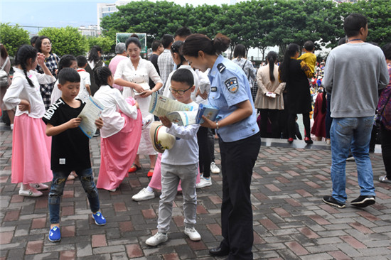 四川新闻网雅安6月6日讯(郑志威 文/图)近日,汉源县公安局走进校园开展以 “关爱学生,反对拐卖”为主题的打拐宣传活动,进一步提高辖区学生的防拐自救意识。 进校后,摆放宣传展板、发放宣传单、设立法律咨询处,多层次、全方位开展打击拐卖学生犯罪宣传活动。活动中,民警们向学生散发宣传单,向围观群众和中小学生介绍打拐案例,讲解法律法规,提醒大家识别拐卖行为,以及如果被拐卖后怎样报警、怎样自救等知识。师生积极参与,纷纷上前参观展板、挂图,咨询相关法律知识。民警们耐心细致的向同学们讲解提高防范意识的重要性和方式方法,使打拐犯罪的法律法规更加普及,深入人心。 |
