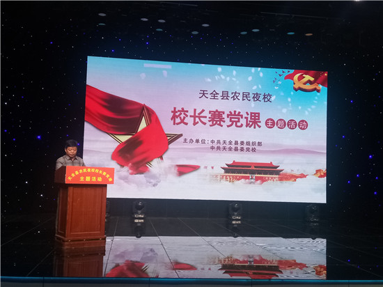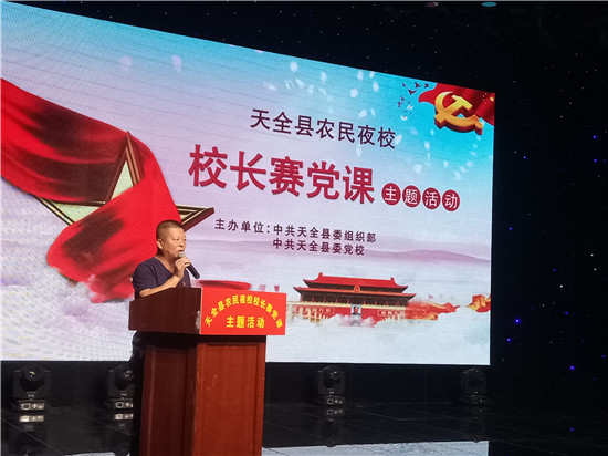 四川新闻网雅安6月25日讯(许玉芳 李琼会 文/图)6月24日上午,由天全县委组织部、天全县委党校共同举办的农民夜校“校长赛党课”主题活动在该县文新广局演播厅举行。来自该县15个乡镇的25名农民夜校校长立足本村实际,围绕如何当好农民夜校校长校、如何办好农民夜校助推脱贫攻坚、如何带领农民群众致富奔康等内容各展所长,尽显风采,台下100余名党员干部到场为比赛喝彩加油。 此次农民夜校“校长赛党课”活动旨在进一步提升农民夜校校长的履职意识和能力,鼓励引导各农民夜校校长主动上讲台、带头讲党课,不断增强农民夜校办学实效,开创农民夜校办学新局面。比赛现场,选手们结合本乡镇、本村(社区)实际,立足自身工作岗位实际,紧扣如何如何抓党建助推脱贫攻坚、如何实现乡村振兴以及新时代农村工作面临的问题和挑战等问题展开精彩论述。整个比赛精彩纷呈,高潮迭起,选手们发自内心讲述自己对农民夜校助推脱贫攻坚的所感所悟,真情流露,在全县党员干部和群众中引起了强烈反响。