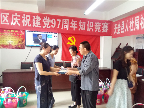 四川新闻网雅安7月6日讯(许玉芳 李琼会 文/图) 7月4日下午,天全县城厢镇新区社区党支部、社区居委会、社区关工委联合天全县人社局社保医保党支部在该社区活动室举行了庆祝建党97周年知识竞赛暨支部联建活动,旨在进一步提高社区党员和社区干部综合素质,增强社区党员干部的党纪法规意识。