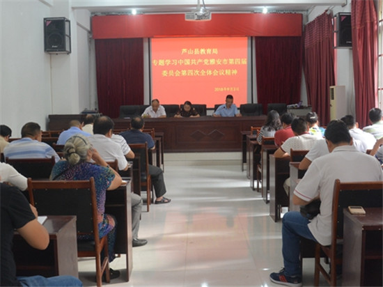 四川新闻网雅安9月4日讯 昨(3)日,芦山县教育局召开职工大会专题学习传达市委四届四次全会精神,全局干部职工50余人参加学习。 会上,局党委委员、副局长樊小平组织学习了《中国共产党雅安市第四届委员会第四次全体会议公报》、《市委关于深入贯彻省委十一届三次全会精神加快建设绿色发展示范市的决定》及说明、兰开驰同志在市委四届四次全会第二次全体会议上的讲话等精神。就深入贯彻落实市委四届四次全会精神,会议向全县教职员工提出了三点要求: