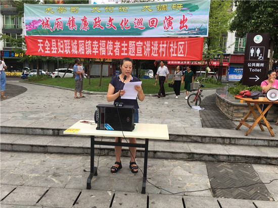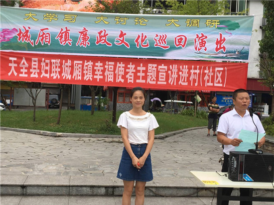 全体演出人员 活动现场,城厢镇专职妇联副主席王泽琼向大家作了以“我爱我家,从我做起” 为主题的幸福使者宣讲,详细阐述了开展幸福使者主题宣讲进村(社区)活动的目的意义。她说,开展以“我爱我家,从我做起”为主题的幸福使者主题宣讲进村(社区)活动是一项具有实际意义的活动,需要你我他的关心、支持与参与。因为您的一份努力,都会让我们的城市和村庄离文明更近;您的每一份辛劳,都会为我们的城市和村庄增光添彩;您的每一份贡献,都会凝聚更多人的责任意识。她倡议广大市民要践行道德规范,维护天全形象;要保护环境,爱护公共设施革除生活陋习;要培养文明风尚遵守交通秩序,珍惜关爱生命。要积极参与乡村振兴,共同建设幸福美丽新家园。廉洁相伴,幸福同行。在文艺演出活动现场,向阳村、东城村、正西社区将一个个鲜活生动的廉政节目搬上舞台。由村(社区)巾帼志愿者自编自演的《撸起袖子加油干》、《新龙船调》、《迎酒欢歌》、《敬你一碗青稞酒》、《走在山水间》、《爱我中华》、《赶圩归来阿哩哩》等10多节目融廉于情,融纪于情,用廉政清风推动廉政建设,充分展现了天全倡廉颂清的决心和毅力,引起了台下观众的共鸣。 城厢镇妇联专职副主席王泽琼作幸福使者现场宣讲