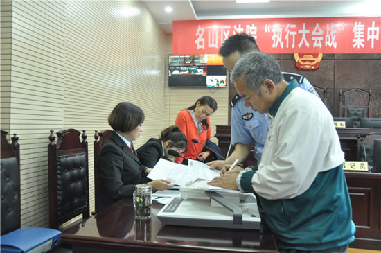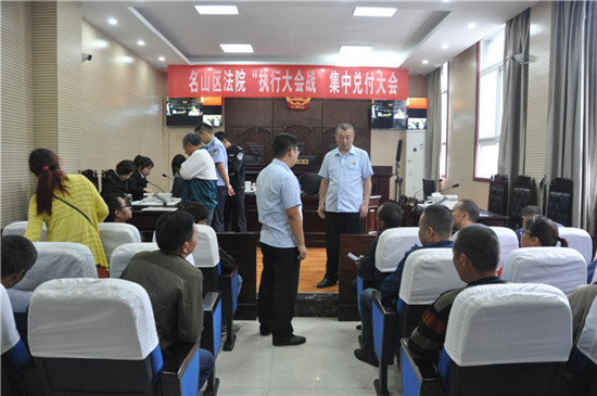四川新闻网雅安9月13日讯(余娟 文/图) 今(13)日上午,名山区法院召开“执行大会战”集中兑付大会,对在“执行大会战”集中执行行动期间及前后执结的劳动报酬、机动车交通事故责任纠纷、民间借贷、买卖合同、赡养费等53起案件的55名申请执行人发放执行案款共计140.08万元。 名山区法院全体参战干警在“执行大会战”中连续奋战,采用多手段、多形式重拳出击,共出动警力66人次,车辆8台次,扣划银行存款12.57万元,查封房产2套,查封土地2宗,查扣车辆2辆,集中曝光25人。将涉民生案件执行作为攻坚战的主攻方向,耐心细致开展调解,刚柔并济威慑“老赖”,期间共执结涉民生案件36件,严历打击了逃避抗拒阻碍执行嚣张气焰,树立了司法权威,收到良好的效果。 “基本解决执行难”工作开展以来,名山区法院在上级法院的有力指导下,坚持目标引领,压紧压实工作责任,举全院之力奋力推进基本解决执行难工作扎实开展。下一步,将继续保持执行高压态势,结合开展各项专项执行活动,大力提升执行质效和执法能力,切实增强人民群众获得感、满意度,确保“基本解决执行难”目标如期完成。 |