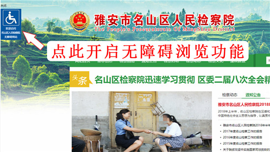 无障碍浏览功能的上线,使得名山区检察院互联网网站的功能得到进一步的完善,充分体现了名山区检察院对有阅读障碍的人民群众的关心和关爱。 |