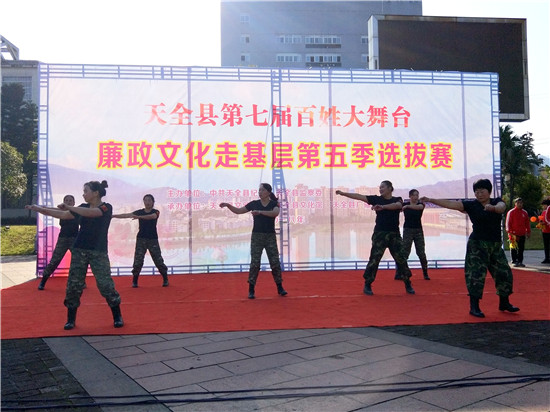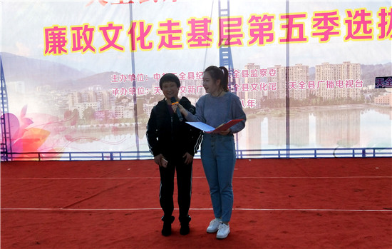 四川新闻网雅安11月13日讯(李琼会 图/文) 11月11日上午,由天全县纪委、天全县监察委主办,天全县文广新局、县文化馆、县电视台、县农村信用合作社联合承办的“百姓大舞台——廉政文化走基层(第五季)”天全县大型电视节目选拔活动在城厢镇文笔广场举行,来自城厢镇、小河乡、紫石乡、两路乡四个乡镇的文艺爱好者为大家提供了一场廉政文化盛宴。天全县500余名干部群众观看了当天的演出。 一直以来,天全县高度重视廉政文化建设,把廉政文化建设纳入党委、政府宣传工作的重要日程,充分运用“三会一课“、农民夜校、党员干部现代远程教育等阵地,强化党风廉政建设宣传教育,大力宣传天全改革发展新成就。同时,该县通过创新宣传形式、创新宣传理念、创新宣传方法、创新宣传载体,在全县形成了”以廉为荣、以贪为耻“的良好社会氛围,扎实推进党风廉政建设宣传工作常态化制度化,为推进高质量发展,建设生态经济强县奠定了坚实基础。 “今天的天全、今天的城厢,发展目标更加明晰、发展基础更加牢固、发展势头更加强劲、政治生态更加清正。” 城厢镇党委书记高月刚在现场致辞。 上午9时30分,城区第二完全小学小朋友带来的舞蹈《快乐的小猴子》拉开了城厢赛区选拔活动的序幕。一群活泼可爱的“小猴子”以不同姿态和表演技艺逗得大家开怀大笑。舞蹈《让中国更美丽》、独唱《微山湖》、空竹表演《空竹梦》、太极表演《太极刀》、小品《王大芳的幸福生活》《不忘初心》……一个个由城厢、小河、紫石、两路四个乡镇文艺队表演的充满本土特色的节目紧扣党风廉政建设主题,轮番上演,精彩的节目表演把活动引向了高潮,赢得了现场观众的阵阵掌声和欢呼声,现场观众纷纷拿起手机拍照片、视频,发到朋友圈里与朋友们一起分享。 不仅文艺节目精彩,由天全县委党校但娅莉老师讲授的微党课——《心中有信仰 脚下有力量》激励着党员群众不断前行,在党风廉政建设知识互动抢答环节更是吸引了现场观众踊跃参与。演出现场,观众们纷纷表示,廉政文化走基层活动真的好,很接地气,不仅让大家有了一场视觉上的盛宴,还将党风廉政知识贯穿其中,让大家对党风廉政建设更加了解,对反腐更有信心。 “这个周未天气好,表演的节目好,心情也好!”城厢镇新区社区居民张阿姨早早来到了活动现场,她一边看一边称赞。“这样的活动要多开展,干部和群众要多交流”张阿姨笑着说。 这几年天全变化太大,环境越来越好,天全县委、政府结合“4.20”芦山强烈地震灾后恢复重建,把龙湾湖、红军广场等作为党风廉政宣传教育阵地进行重点打造,在广场设有廉政文化宣传栏、建有廉政文化长廊,制作了一些富有地方特色的廉政格言警句的石碑、廉政公益广告和标语,真正的让党风廉政建设深入人心。 截止目前,天全县已在仁义、多功、始阳、城厢开展了四场选拔赛活动。 “通过举办天全县百姓大舞台廉政文化走基层第五季选拔赛活动,不仅为群众提供了一个展示自己的平台,而且让全县党员干部群众充分感受到党风廉政建设和反腐败斗争取得的新进展新成效,不断增强群众的获得感和满意度 ,凝聚加快绿色发展振兴的强大合力”天全县委常委、纪委书记陈国明说道。