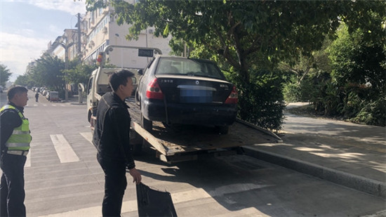四川新闻网雅安11月14日讯(李晓彤 文/图) 为规范停车秩序、净化交通环境、有效清除道路交通安全隐患,助力文明城市的创建,昨(13)日,汉源县公安局交警大队接到群众举报,在江汉大道一段路边停放着一辆破旧的小型黑色轿车,由于停放时间较长,已经影响居民日常生活。 民警立即赶到现场,看到一辆破旧的黑色上海华普轿车,该车车头、车窗均已破损,车胎明显干瘪,打开车门看到车厢内部破旧不堪,车身以及车内布满尘土,看上去停放的时间较长。民警立即查询车辆信息联系车主,经查询,民警发现该车已逾期未年检,并且经过多方查找并未与车主取得联系。随即民警通知拖车赶到现场,依法将这辆“僵尸车”拖移清理。
