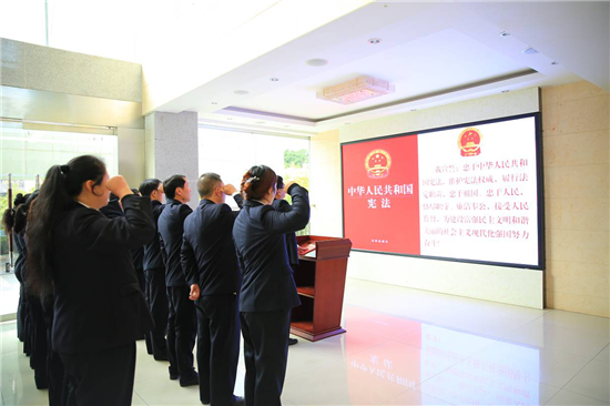 四川新闻网雅安12月8日讯 12月4日是第五个国家宪法日。为进一步弘扬宪法精神,维护宪法权威,汉源县检察院以“尊崇宪法、学习宪法、遵守宪法、维护宪法、运用宪法”为主题,多形式开展国家宪法日暨“宪法宣传周”系列法治宣传教育活动。 举行宪法宣誓仪式。上午10点,全院干警统一身着检察制服、胸佩检徽,站在国旗国徽前,在党组书记、检察长兰树林的领誓下,面向宪法庄严宣誓。兰树林检察长指出,宪法是国家的根本大法,检察机关负有维护宪法尊严、保证宪法实施的神圣职责。集体宣誓活动不仅是一种仪式,更表达了检察官对宪法和法律的尊重与敬畏,传递了全体检察人员始终忠诚履职,保障宪法法律实施的决心和信心。全体干警要坚决做到“两个维护”,把宪法的精神落实到各项检察工作中去,保证宪法法律在执法办案的各个环节得到遵守和执行,让铮铮誓言内化于心外化于行。 组织全院干警开展宪法法律学习。召开党组理论中心组学习会,学习贯彻习近平总书记全面依法治国新理念新思想新战略和宪法修正案,深刻领会精神实质,准确把握核心要义,坚决做到“两个维护”。同时,利用办公大楼户外LED、大厅LED显示屏和展板,播放宪法宣传标语和宪法知识宣传片,宣传宪法知识,推动国家工作人员带头尊崇宪法、学习宪法、遵守宪法、维护宪法、运用宪法。