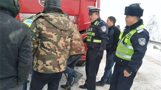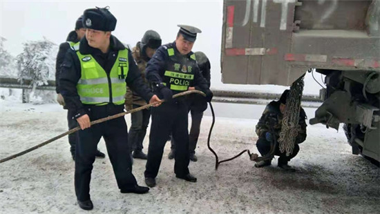 四川新闻网雅安12月13日讯(李晓彤 文/图)近日,汉源辖区泥巴山路段普降大雪,道路积雪、冰凌严重,极易发生交通事故,汉源县公安局交警大队结合当前开展的“百日安全行动”专项整治,为预防重特大交通事故发生,清溪驻乡组警员全员上路,加强泥巴山路段巡逻管控,确保道路交通安全畅通。 12月11日上午8时许,清溪驻乡民警在泥巴山冬管路段开展路面巡查,巡查至2485km处时,发现一辆车牌皖Kbt××牌挂车前轮掉入路旁排水沟。驻乡警员见此情况便下车询问,得知由于路面积雪、冰凌严重,该挂车因只悬挂单驱链条导致车辆打滑被困排水沟里,无法继续前行。因该挂车被困位置处于下坡弯道处,为避免该路段发生二次交通事故,了解情况后,驻乡警员立即展开救援工作,一边安排民警做好被困车辆两头的来车指挥工作,一边帮助被困车辆安装防滑链、挂钢绳,帮助被困车辆驶出危险路段。虽然当时凛冽寒风,驻乡警员手脸冻得通红,但却无一人喊累喊苦。经过一个多小时的艰辛救援,被困挂车终于顺利起步,备受感动的驾驶员在车辆起步通过时挥手告别,对交警风雪中及时出手相助表示感谢,离开之际,驻乡警员还不忘叮嘱驾驶员行驶途中一定要减速慢行、谨慎驾驶,遇到困难时一定要沉着冷静处理。