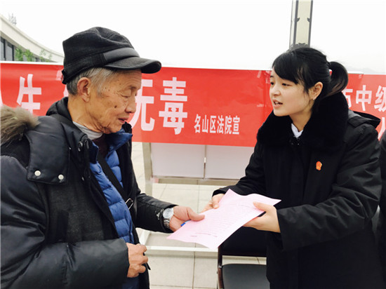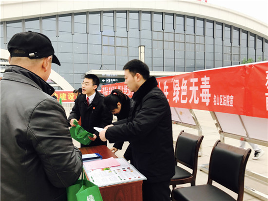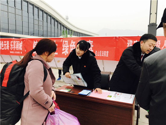 四川新闻网雅安1月24日讯(何潇翔 文/图)1月24日,名山区法院在雅安市火车站参加了全市“今冬明春禁毒宣传下基层活动”,活动期间干警对新修订的《四川省禁毒条例》、《刑事诉讼法》等相关法律进行了宣传。