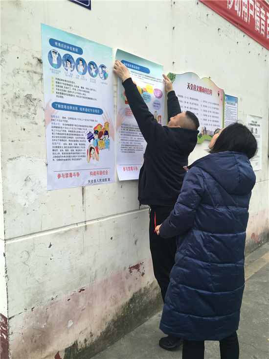 四川新闻网雅安1月29日讯(向笛 文/图)春节将至,天全县在外求学的学生以及外出务工人员陆续返乡,为切实做好春节期间禁毒宣传工作,确保大家过上一个欢乐祥和的春节,1月25日,天全法院开展了年前禁毒宣传系列活动。 本次宣传制作了三种不同内容的禁毒海报,主要介绍了常见毒品种类、吸食毒品的症状和社会危害、常见引诱吸食毒品行为,并将不同内容的海报张贴于翡翠豪庭、南阳锦城、水韵嘉苑等城区主要居住小区。在张贴海报的同时,向过往行人进行禁毒知识宣讲,提醒人们注意防范。针对放寒假的学生以及返乡人员增多,天全法院还深入到城区KTV等娱乐场所进行禁毒宣传。