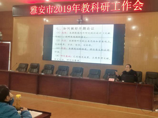 四川新闻网雅安3月9日讯 为积极贯彻落实雅安市教育大会精神,围绕雅安市建设“川西教育中心”,打造“学在雅安”教育品牌目标,科学推进全市教研、教育科研工作,促进教育教学质量的提高,提升教育科研课题的研究质量,3月6-7日,雅安市教研工作会、教科研工作会在天全县第一初级中学召开。 3月6日上午,全市教研工作会召开,各区(县)分管教育副局长、教研员等40余人齐聚天全县第一初级中学会议室,商讨教研、教育科研工作。会上,雅安市教育局副局长姜建平强调,教研工作和教育科研工作是教育教学工作的重要组成部分,全市各区(县)教育局、各学校要高度重视,努力探索有效工作途径,力争将全市教研工作、教育科研工作做出特色、做出亮点。各区(县)教育局结合自身工作实际在会上做了交流发言。 3月6日下午和7日上午,全市2019年教育科研会继续在天全县第一初级中学召开。市教科所王浩老师就科研课题研究工作向与会人员进行专题培训,从科研课题的选题、方案制作、操作步骤等做了详细的讲解和指导。