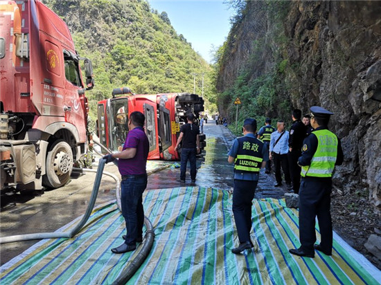 四川新闻网雅安4月26日讯 4月24日11时41分许,天全县公安局两路派出所接群众报警称:在国道318线天全县两路乡处(小地名:老鹰岩)发生一起油罐车侧翻,车上的柴油正在向外流出,现场堵车,情况紧急! 接到报警后,民警庚即赶往现场,到达现场后经侦查和询问获知,有一辆载有30吨的柴油车侧翻,罐体部分变形,但无人伤亡和受困。民警立即向指挥中心汇报现场情况,天全县副县长、公安局局长曾勇高度重视,庚即带领公安局党委委员、副局长杨韩松及公安、消防、应急、安监、交通、环保等相关部门迅速赶往现场进行处置救援。在救援现场,曾勇在实地查看了罐体柴油泄露和现场周边情况后庚即下达指令,立即实施交通管制、拉起警戒带疏散周边群众、安排吊车吊起侧翻车辆、处理路面油渍,要求各处置单位做到科学施救、安全施救。 历经5小时连续作业,侧翻车辆被吊走,路面油渍处理干净,国道318恢复通畅。(天全县公安局供稿) |