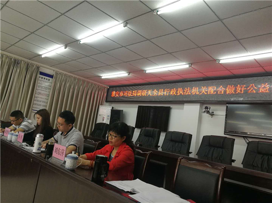 四川新闻网雅安5月8日讯(邹涛 江涛 文/图)4月29日,雅安市司法局副局长羊平、行政执法监督科科长刘东萍一行就行政执法机关如何全面推动行政公益诉讼工作到天全县开展调研。天全县检察院及县生态环境局、县自然资源和规划局、县住房和城乡建设局等26家行政执法单位负责人参加了此次调研座谈会。 首先,县检察院就检察机关提起公益诉讼的背景、意义、主要内容、方式及天全县公益诉讼工作开展情况向与会人员作了全面汇报。并针对当前机构改革,行政机关职能划转调整,职责权限不明及行政公益诉讼工作中调查取证难、法律适用分歧、检察建议回复整改存在应付等问题进行了列举。各参会单位结合自身职责就履职中存在问题及如何配合检察机关开展公益诉讼工作积极交流发言。