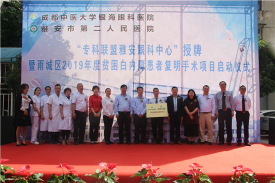 四川新闻网雅安5月23日讯(许玉芳 文/图)眼睛是人类心灵的窗户,是人们无比爱护的重要器官,5月21日,雅安市第二人民医院举行“专科联盟雅安眼科中心”暨雨城区2019年度贫困白内障患者复明手术项目启动仪式。 为了解决雅安受到的人才技术影响,长期以来眼科医疗水平发展滞后的这一迫切问题,雅安市二医院按照国家医改医联体建设的思路对接成都优质资源。经过一年多的努力,市二医院与成都中医药大学银海眼科医院共同成立“专科联盟雅安眼科中心”,为雅安眼科引进高端专家资源和优秀管理技术。 据了解,“专科联盟雅安眼科中心”成立之后,成都中医药大学银海眼科医院主任医师潘学会,成都中医药大学银海眼科医院眼科医联体主任、眼科学博士陈小凤,成都中医药大学银海眼科医院眼科主任、副主任医师高溶等眼科专家将定期到市二医院开展门诊和进行手术。
