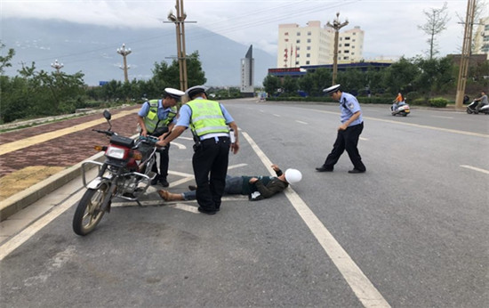 四川新闻网雅安6月11日讯(李晓彤 徐玉莲 文/图)6月9日上午10时许,汉源县公安局交警大队民警在九襄梨花大道巡逻时,发现一名男子倒在路边,摩托车将他压在身上,男子一动不动,意识模糊。