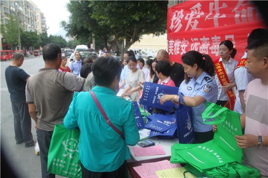 四川新闻网雅安6月27日讯 为深入宣传毒品危害、提高全民禁毒意识,充分发动人民群众参与禁毒斗争,形成全县人人关注毒品、人人参与禁毒斗争的良好局面。6月25日上午,汉源县公安局联合县综治办、司法局、检察院、法院、妇联、团委、文新广局、疾控中心、工会、教育局、交通局、药监局、民政局、工商局、移民局等禁毒成员单位,在县城东区综合市场外,围绕“绿美汉源 拒绝毒品”这一宣传主题,集中开展了“6.26”禁毒宣传活动。 活动中,通过采取悬挂横幅、印发宣传布袋,散发宣传资料、发放宣传图册,展示禁毒相关挂图、展板,并在人流交汇处、人员聚集地、经贸繁华区,通过LED电子屏滚动播放禁毒宣传片等形式,向群众宣讲《禁毒法》及毒品预防常识,讲解传统和新型毒品的种类、特性、毒品对个人、家庭和社会的危害,教育青少年如何“自卫防毒”,以及如何识别制毒加工窝点的简易方法,如何举报抵制毒品等知识。 此次宣传活动,共发放各种自制宣传资料10种3000余份。在集中宣传的同时,通过县城、九襄街面的大屏幕电视及各单位、宾馆、店铺的LED显示屏滚动播出禁毒宣传标语、口号上千余条次,受教育群众达万余人,有力推动了汉源县“禁毒宣传月”活动的深入开展。(汉源县公安局供稿) |