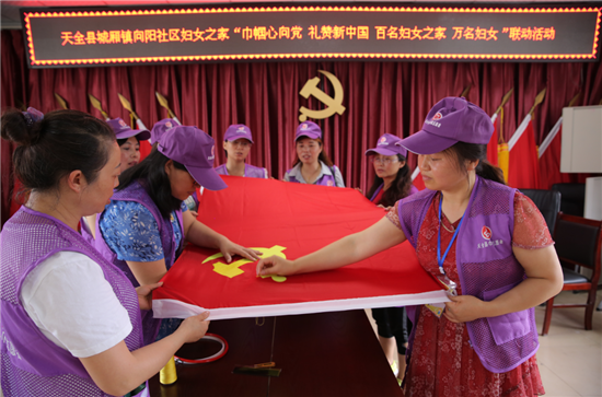 四川新闻网雅安6月30日讯 2019年是新中国成立70周年,天全县妇联积极响应全国妇联开展“巾帼心向党 礼赞新中国”群众性宣传教育活动的号召,以“妇女之家”、“儿童之家”、村(社区)活动中心等为主要阵地,以互联网为重要平台,以“唱、讲、写、建、维、助”为主要内容,线上线下共同发力,把群众发动起来,让妇女参与进来,使基层活跃起来,以实际行动建功新时代,向祖国华诞献礼。 唱响祖国颂歌