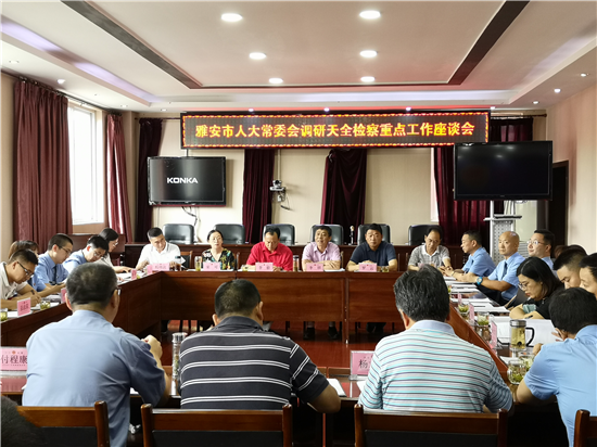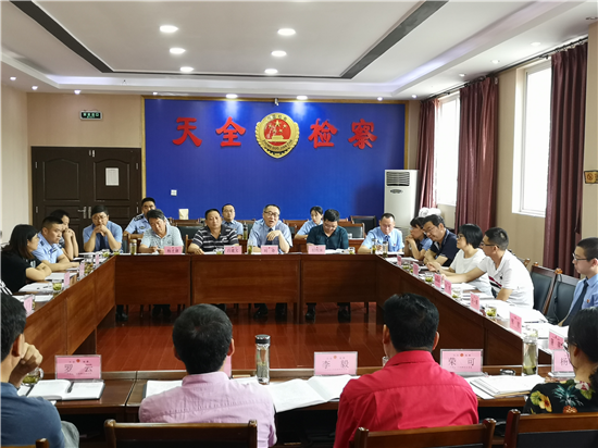 四川新闻网雅安7月4日讯(马伟 文/图)6月27日,雅安市人大常委会李毅副主任一行八人在市院党组成员、副检察长赵学东等领导的陪同下,调研天全县人民检察院扫黑除恶专项斗争、公益诉讼、服务保障民营经济发展、国家司法救助融入脱贫攻坚工作以及特色亮点工作并召开了座谈会。